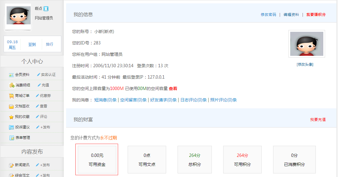 2、 资金充值自动冲入到您会员账户中 如下图显示: